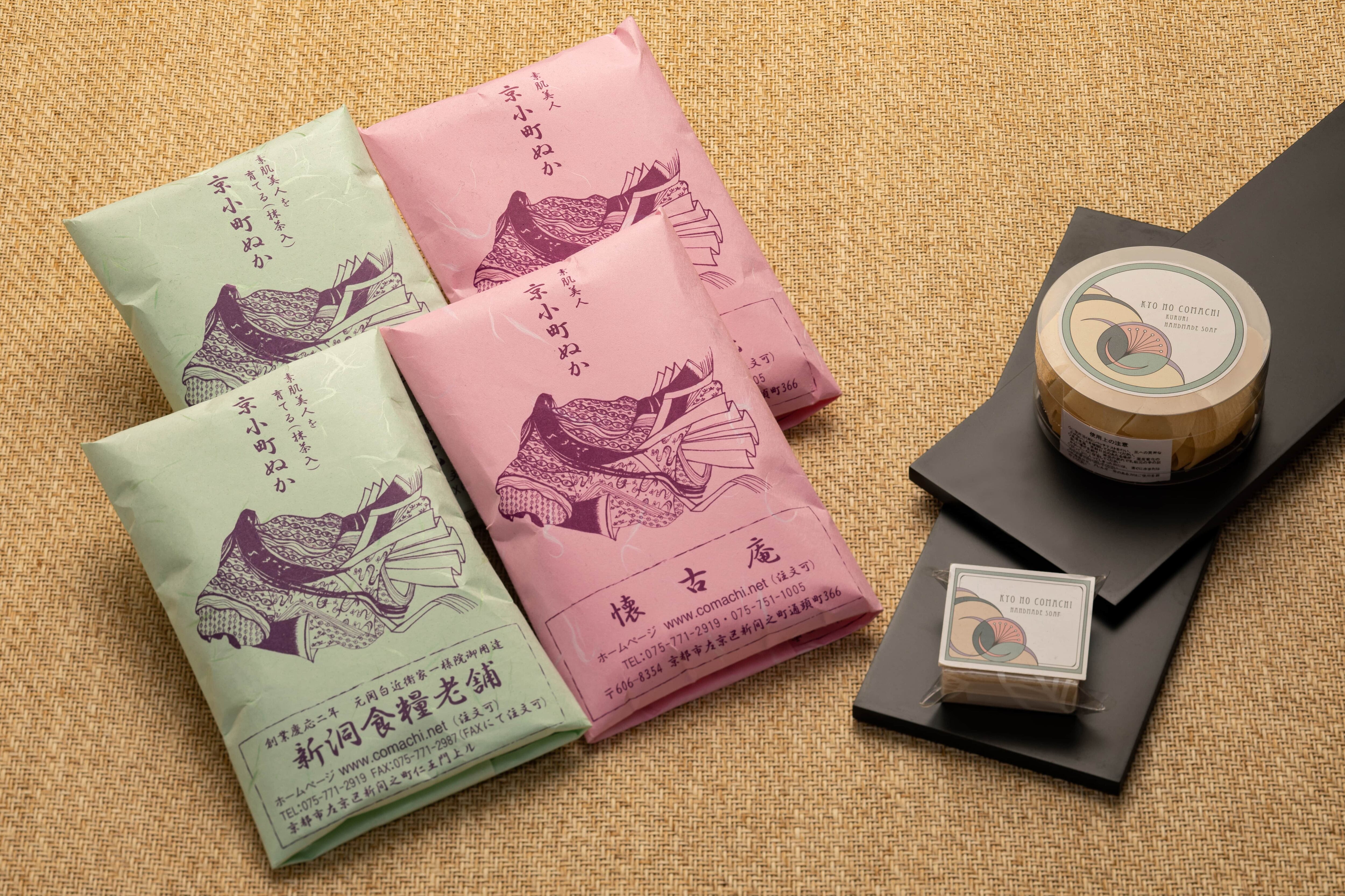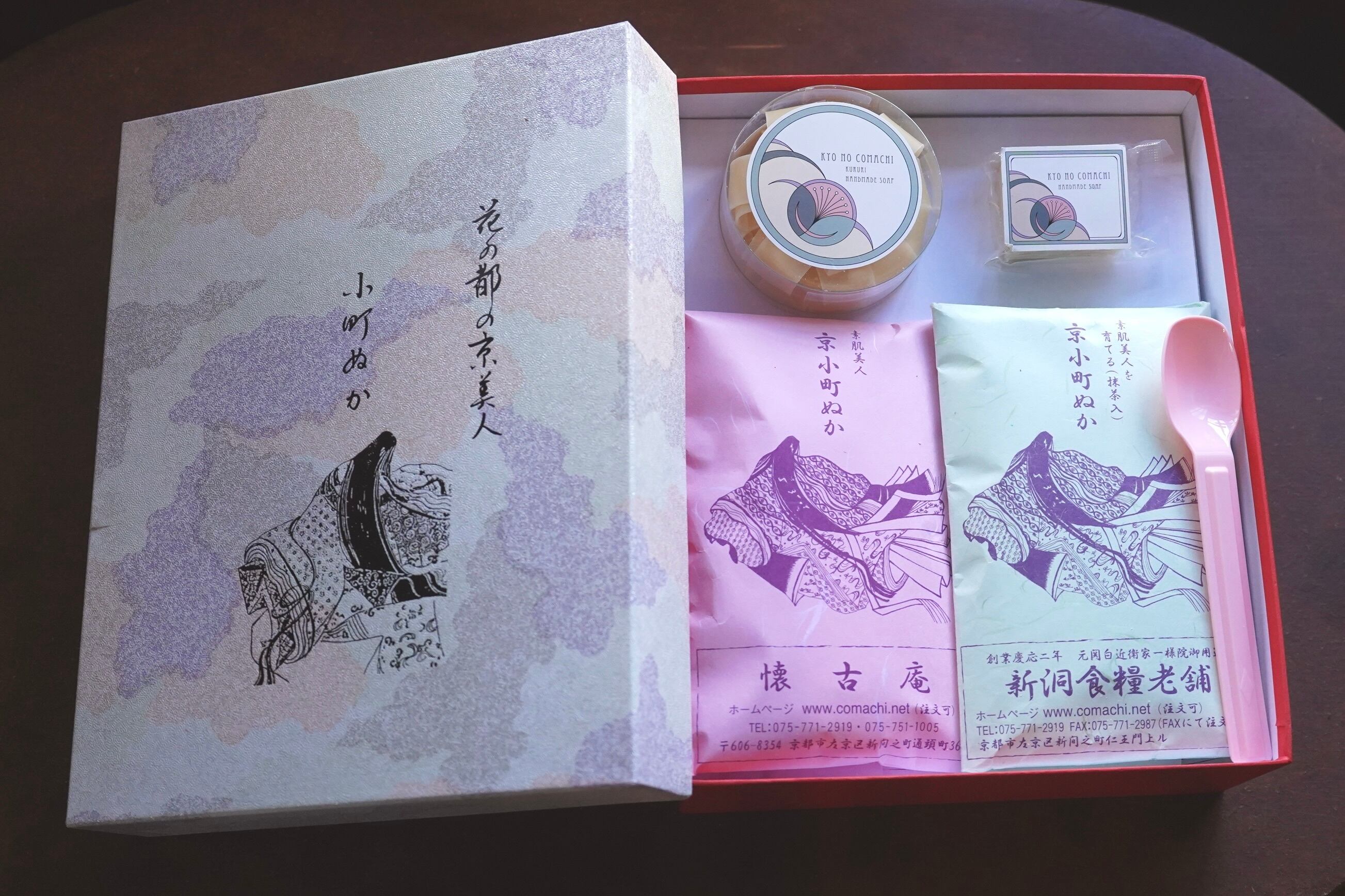 「京小町ぬか」と「京のこまち石鹸」、「京のこまち石鹸くるり」のお得な箱入りセットです。